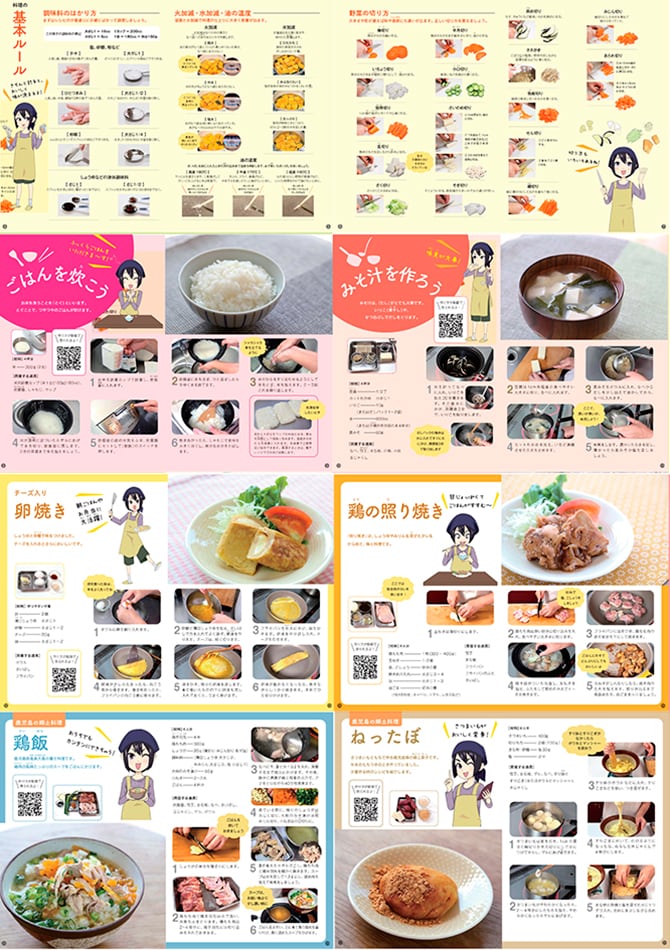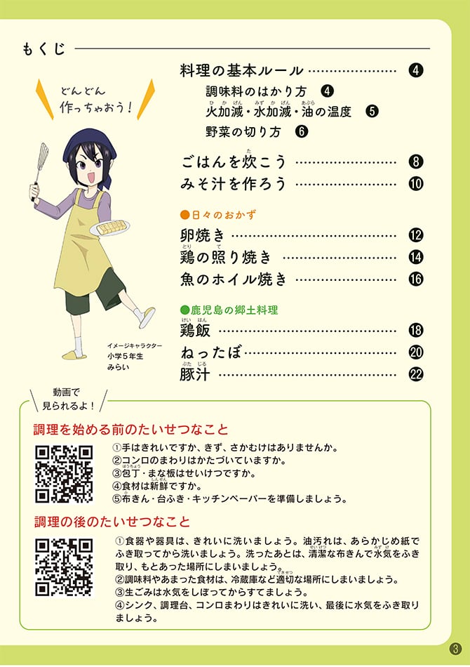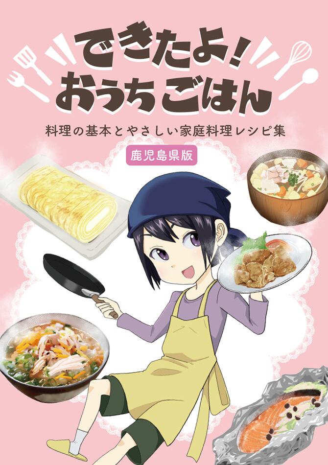 小学5年生以上を対象とした、料理の基本とレシピ8種。ご飯の炊き方からみそ汁や卵焼き、ねったぼや鶏飯など。料理用語や切り方、火加減・水加減などをわかりやすく解説。